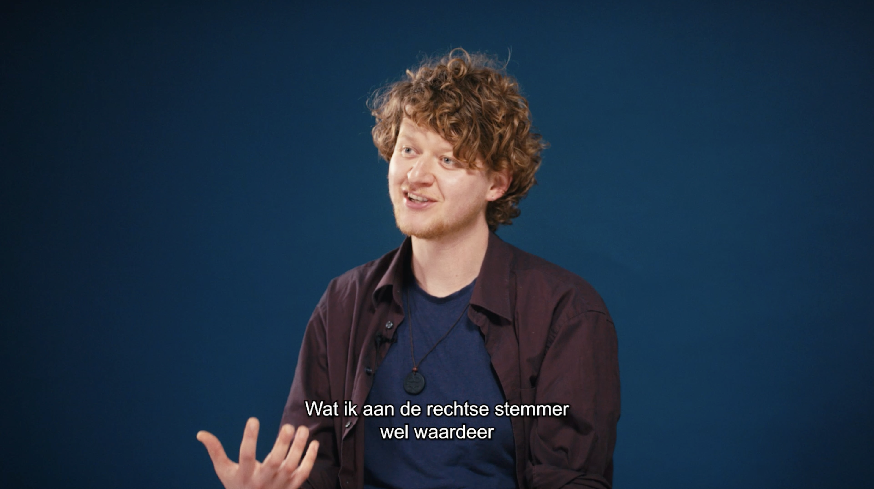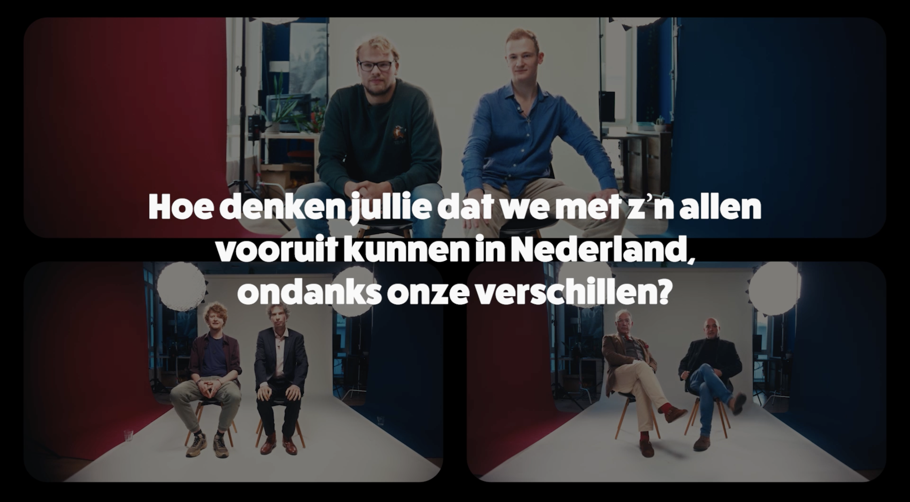 VerderSamen vertelt zijn verhaal volledig via beeld. Linkse deelnemers zitten voor een rode achtergrond en kijken naar rechts. Rechtse deelnemers zitten voor blauw en kijken naar links. Twee kanten, duidelijk zichtbaar naast elkaar, zonder elkaar te vermijden.