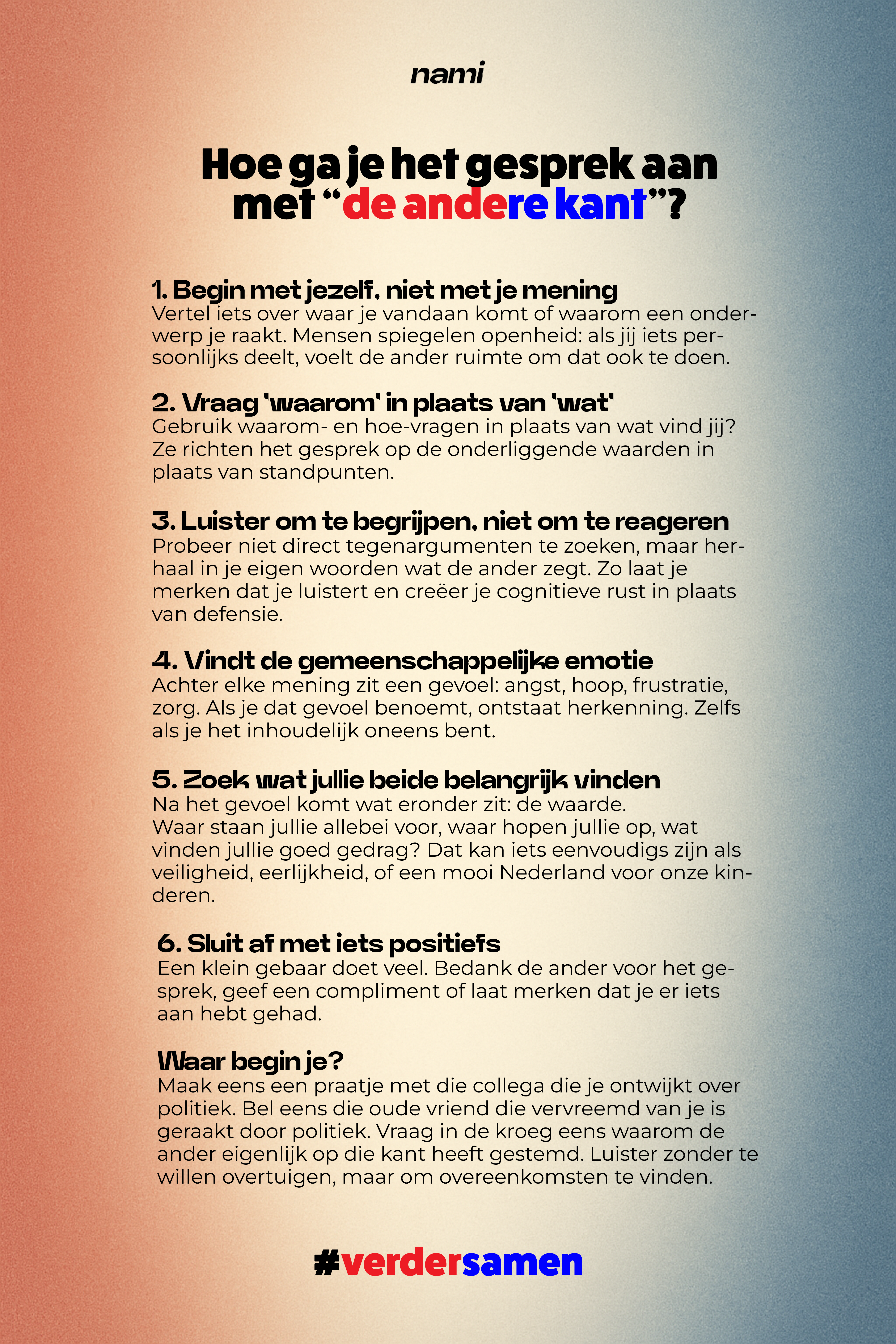Een goed gesprek draait niet om wie er gelijk krijgt, maar om wie er begrip wint. Juist door het ongemak in te stappen, kunnen we elkaar weer ontmoeten, want pas als we luisteren, komen we #verdersamen.