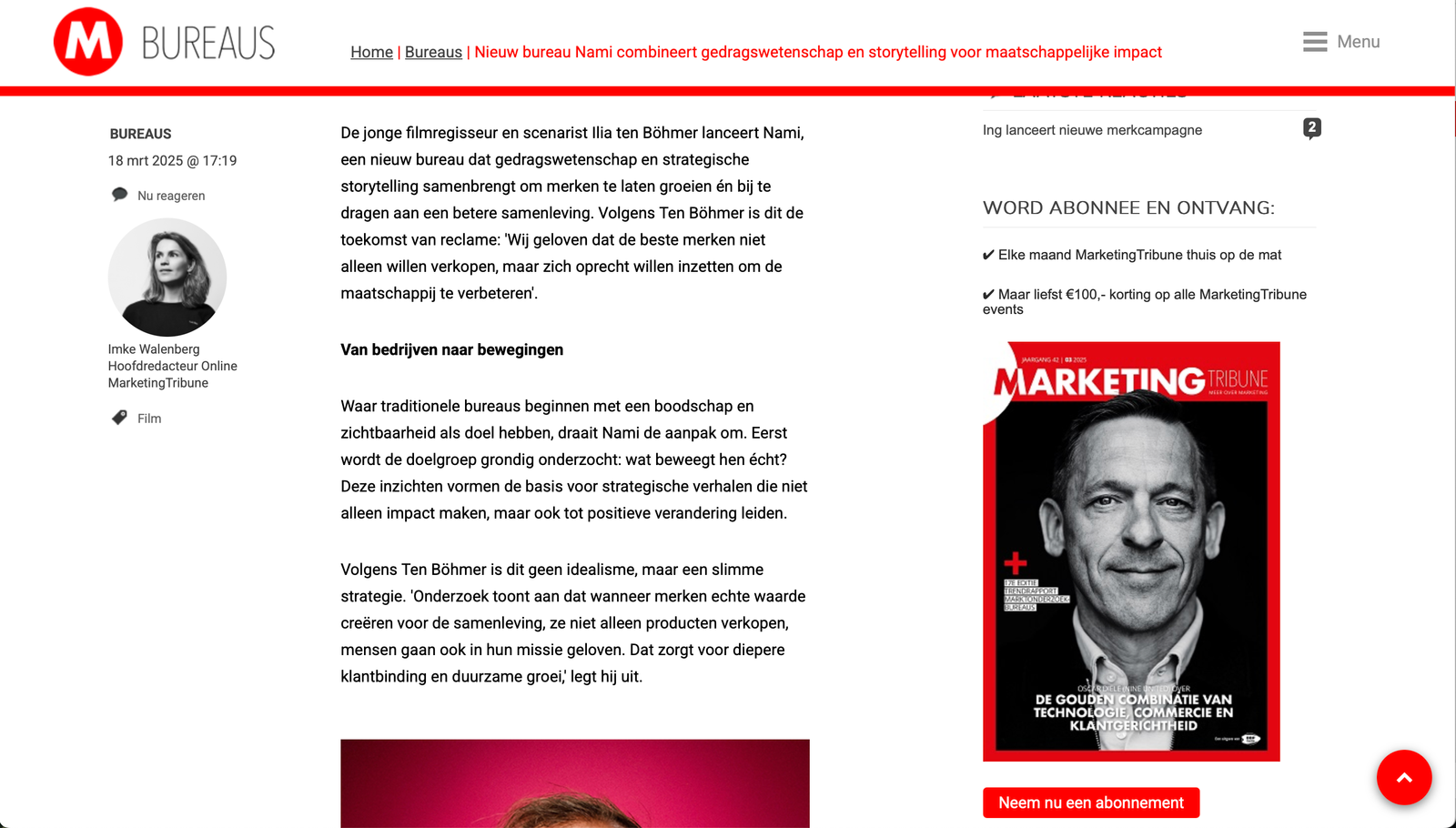 We are pleased to be featured in MarketingTribune, where our founder, Ilia ten Böhmer, discusses Nami's mission to integrate behavioral science with strategic storytelling. This approach aims to foster brand growth while contributing positively to society.