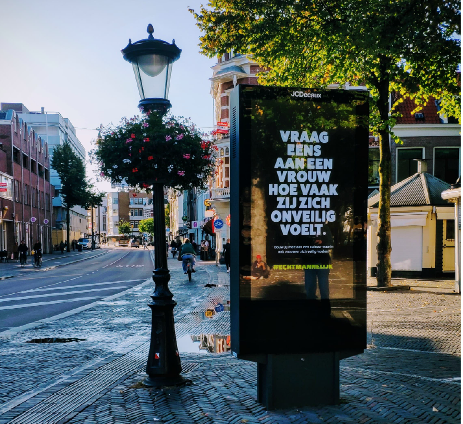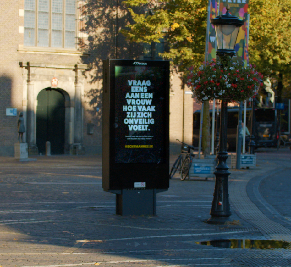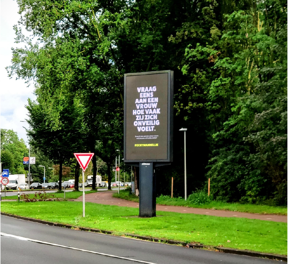 The power of #EchtMannelijk lies in how directly it targets the root of the problem in the most simple way. Because we have zero budget or partners, we started with one trial post on social media to see if the message resonated. It had texts that challenged or redefined what masculinity means in the context of (micro-)violence against women, together with men posing for the camera with the text: 'I help build a culture in which women also feel safe'. The post exploded after which the message appeared on billboards, message trailers, and digital screens in high-traffic locations such as train stations, city squares, and highways. Each displayed our first confronting question: “Ask a woman how often she feels unsafe.”